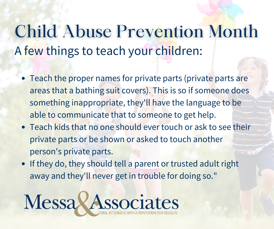 “April is Child Abuse Prevention Month. Did you know statistics show that 1 in 4 girls and 1 in 6 boys will be sexually abused before they turn 18? That’s a pretty shocking statistic and we all should want to help prevent child abuse so here are a few ways to do so. First, you need to recognize that preventing child abuse is an adult’s responsibility, not a child’s. Although you may be familiar with the phrase “stranger danger,” most children are abused by someone they know and trust. With this in mind, it’s important to talk to your kids about body safety.”