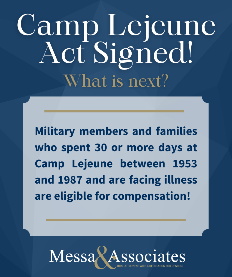 In light of the recent findings regarding the water contamination at Camp Lejeune, Messa & Associates is now filing claims on behalf of military members and their families who spent 30 or more days at Camp Lejeune. If this sounds like you and you are interested in filing a claim, please contact our offices by calling 215-568-3500 or submit a case online.